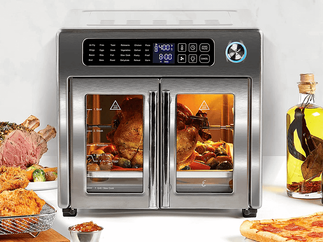 Cooking Presets: Air Fry, French Fries, Toast, Rotisserie, Chicken, Pizza, Wings, Egg, Steak, Vegetable, Defrost, Grill, Bacon, Ribs, Fish, Slow Cook, Pastry, Baking, BBQ, Baking, roasting, dehydrating, reheating