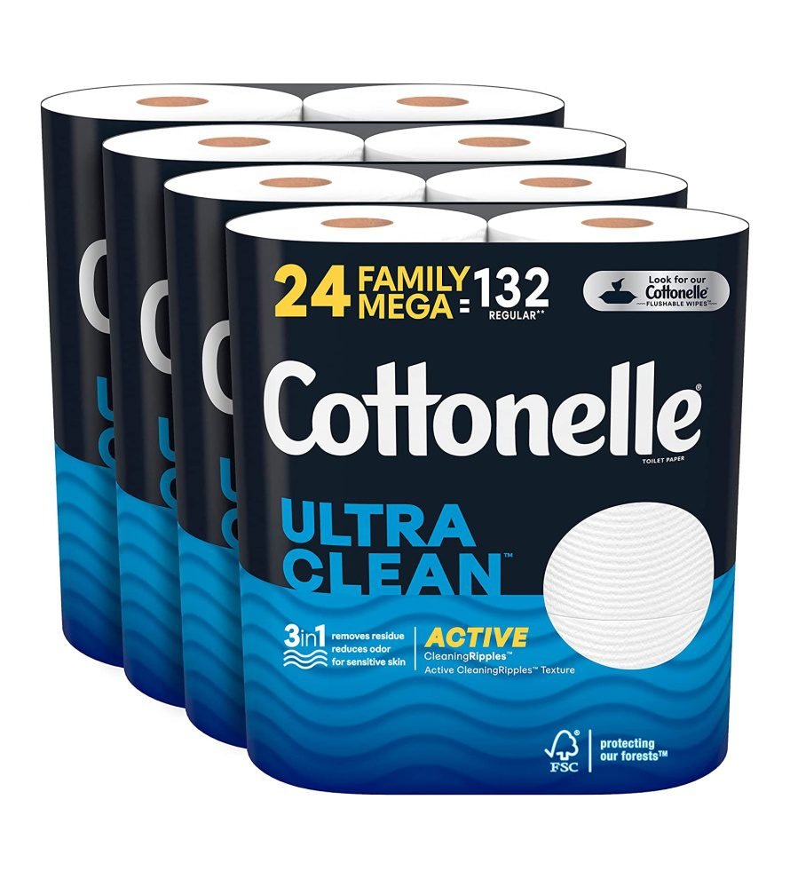 24 FAMILY MEGA ROLLS: Cottonelle Ultra Clean Toilet Paper with Active CleaningRipples Texture, 24 Family Mega Rolls (4 packs of 6); 388 sheets per roll.