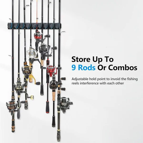 STORE 9 RODS OR COMBOS – The vertical fishing rod holder can store up to 9 rods or combos neatly and securely in less than 16 inches of horizontal wall space.Most other brands can only store 3 or 6 combos in the same amount of space. Fishing rods and reel combos can be mounted on the rack at any position of rod length, which make the reels can be staggered at different heights to minimize storage space.